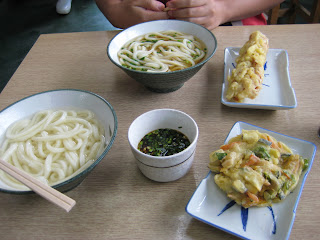 我選的是釜揚げうどン(かまげうどん),燙好的麵條泡在湯裡,附了一碗醬料,裡面的醬油加了蔥花,帶著淡淡的薑味,吃起來很爽口。